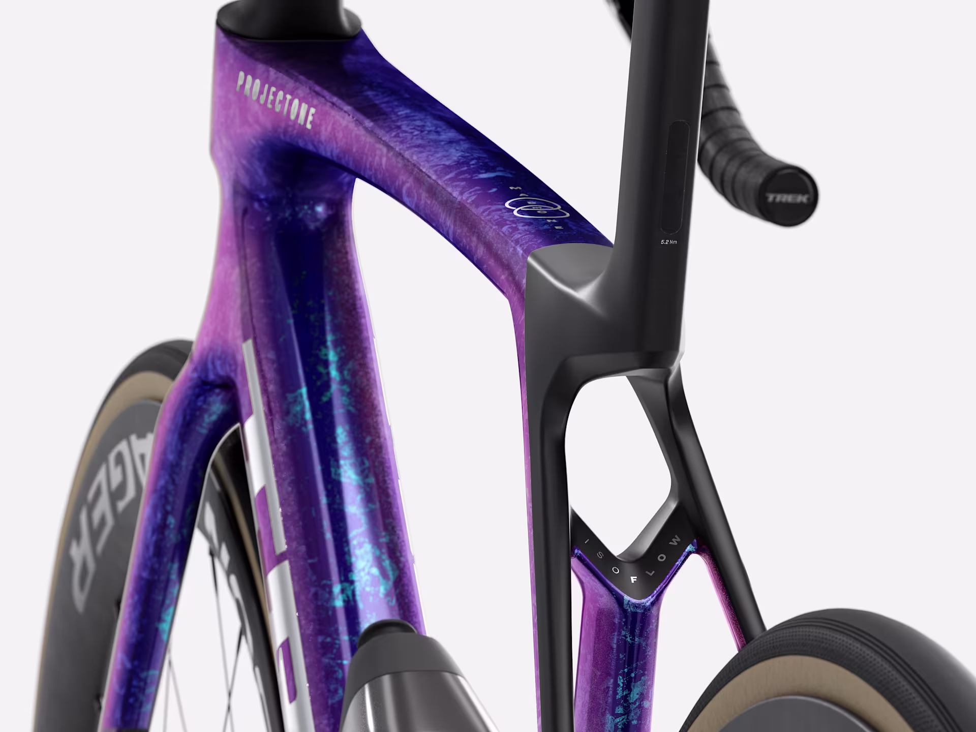 Widelec | Carbonowy „Madone Gen 8”, zwężana rura sterowa z włókna węglowego, wewnętrzne prowadzenie linek hamulcowych, mocowanie hamulca tarczowego flat mount, oś 12×100 mm z fazowaniem |